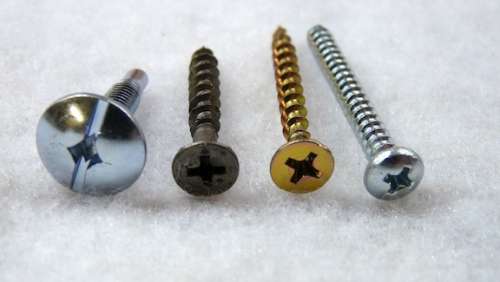 The photo above shows (from left to right) a proper dead front or panel cover screw, along with three improper but commonly used screws, including a particleboard screw, a gold deck screw, and a machine screw.