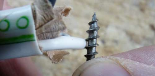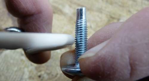 In the two photos above, you can see the difference between the finer threads on the screw from a Square-D panel and the more deeply cut, widely spaced threads of a typical coarse-thread screw. The risk of cutting through the insulation that protects the wire conductors may be greater with the threads along the shaft of the screw than with the point of the screw.
